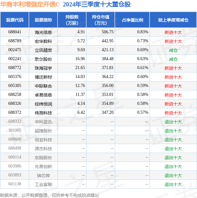 从基金规模来看,华商丰利增强定开债C基金2024年三季度公布的基金规模为0.46亿元,较上一期规模4342.72万元变化了276.7万元,环比变化了6.37%。该基金最新一期资产配置为:股票占净值比21.66%,债券占净值比87.24%,现金占净值比2.01%。从基金持仓来看,该基金当季前十大股票仓位达6.41%,第一大重仓股为海光信息(688041),持仓占比为0.83%。