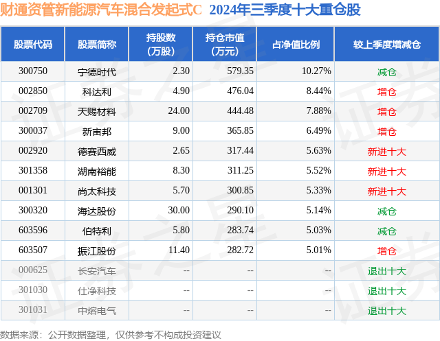 证券之星消息,日前财通资管新能源汽车混合发起式C基金公布三季报,2024年三季度最新规模0.48亿元,季度净值涨幅为19.75%。