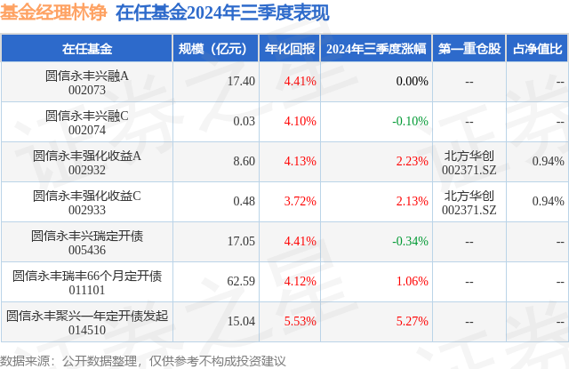 从基金规模来看,圆信永丰强化收益A基金2024年三季度公布的基金规模为8.6亿元,较上一期规模12.81亿元变化了-4.21亿元,环比变化了-32.89%。该基金最新一期资产配置为:股票占净值比16.74%,债券占净值比106.52%,现金占净值比2.35%。从基金持仓来看,该基金当季前十大股票仓位达4.61%,第一大重仓股为北方华创(002371),持仓占比为0.94%。