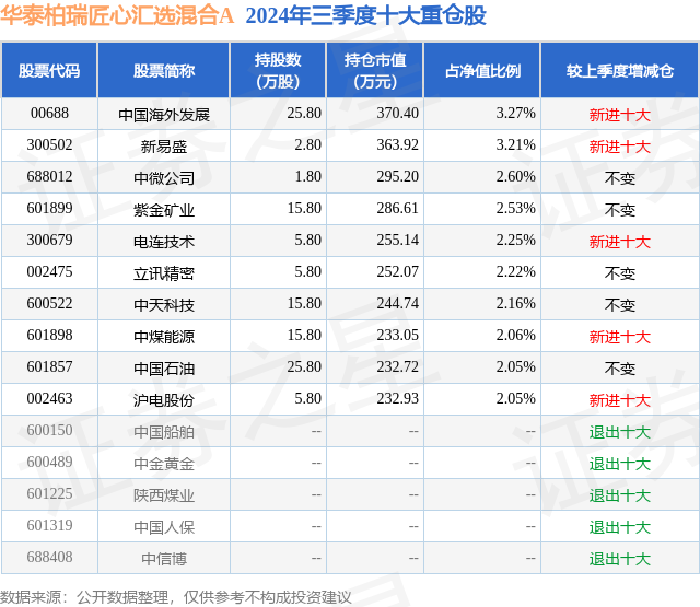 从基金规模来看,华泰柏瑞匠心汇选混合A基金2024年三季度公布的基金规模为1.04亿元,较上一期规模1.01亿元变化了278.16万元,环比变化了2.74%。该基金最新一期资产配置为:股票占净值比88.37%,无债券类资产,现金占净值比11.94%。从基金持仓来看,该基金当季前十大股票仓位达24.4%,第一大重仓股为中国海外发展(00688),持仓占比为3.27%。