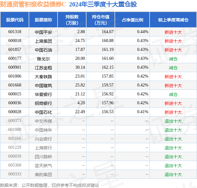 从基金规模来看,财通资管积极收益债券C基金2024年三季度公布的基金规模为0.1亿元,较上一期规模5896.04万元变化了-4918.09万元,环比变化了-83.41%。该基金最新一期资产配置为:股票占净值比12.75%,债券占净值比110.24%,现金占净值比4.54%。从基金持仓来看,该基金当季前十大股票仓位达4.25%,第一大重仓股为中国平安(601318),持仓占比为0.44%。