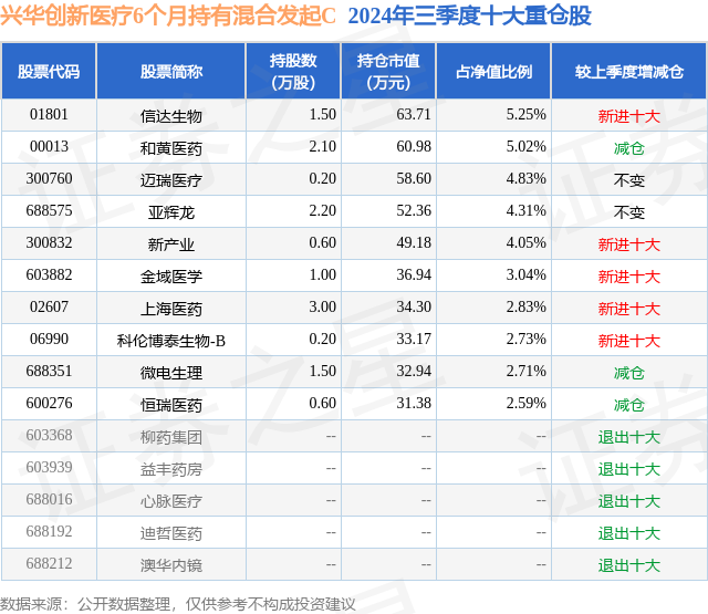证券之星消息,日前兴华创新医疗6个月持有混合发起C基金公布三季报,2024年三季度最新规模0.02亿元,季度净值涨幅为14.9%。