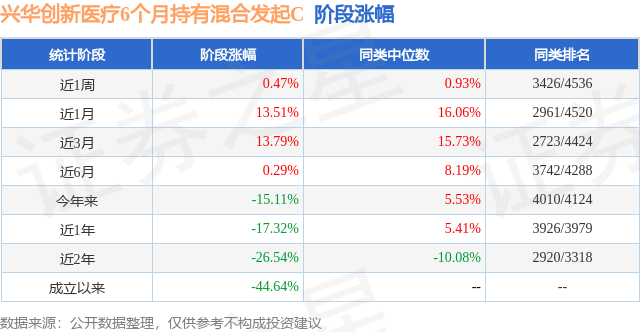 从业绩表现来看,兴华创新医疗6个月持有混合发起C基金过去一年净值涨幅为-17.32%,在同类基金中排名3926/3979,同类基金过去一年净值涨幅中位数为5.4%。而基金过去一年的最大回撤为-28.0%,成立以来的最大回撤为-32.95%。