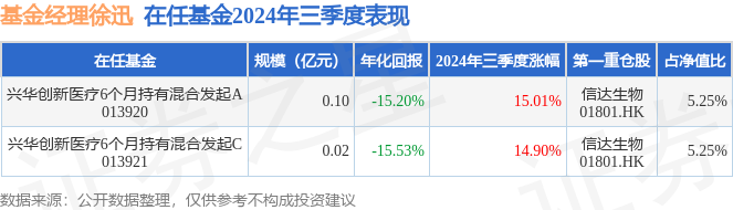 兴华创新医疗6个月持有混合发起C现任基金经理为徐迅。其中在任基金经理徐迅已从业1年又141天,2024年4月30日正式接手管理兴华创新医疗6个月持有混合发起C,任职期间累计回报为-2.91%。目前还管理着2只基金产品(包括A类和C类),其中本季度表现最佳的基金为兴华创新医疗6个月持有混合发起A(013920),季度净值涨幅为15.01%。