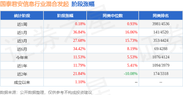 从业绩表现来看,国泰君安信息行业混合发起基金过去一年净值涨幅为11.79%,在同类基金中排名1094/3979,同类基金过去一年净值涨幅中位数为5.4%。而基金过去一年的最大回撤为-33.35%,成立以来的最大回撤为-39.57%。