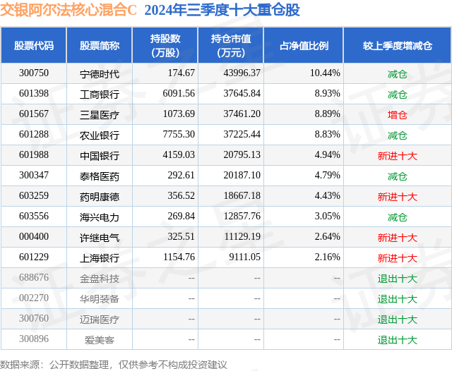 从基金规模来看,交银阿尔法核心混合C基金2024年三季度公布的基金规模为1.23亿元,较上一期规模1.34亿元变化了-1127.16万元,环比变化了-8.38%。该基金最新一期资产配置为:股票占净值比68.09%,债券占净值比5.28%,现金占净值比22.06%。从基金持仓来看,该基金当季前十大股票仓位达59.1%,第一大重仓股为宁德时代(300750),持仓占比为10.44%。