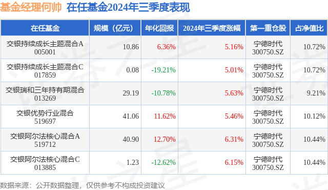 交银阿尔法核心混合C现任基金经理为何帅。其中在任基金经理何帅已从业9年又113天,2021年11月12日正式接手管理交银阿尔法核心混合C,任职期间累计回报为-32.86%。目前还管理着6只基金产品(包括A类和C类),其中本季度表现最佳的基金为交银阿尔法核心混合A(519712),季度净值涨幅为6.31%。
