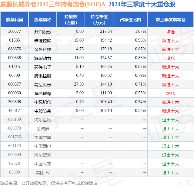 从基金规模来看,景顺长城养老2035三年持有混合(FOF)A基金2024年三季度公布的基金规模为2.02亿元,较上一期规模1.62亿元变化了4085.63万元,环比变化了25.29%。该基金最新一期资产配置为:股票占净值比9.75%,债券占净值比4.19%,现金占净值比2.49%。从基金持仓来看,该基金当季前十大股票仓位达7.7%,第一大重仓股为开润股份(300577),持仓占比为1.07%。