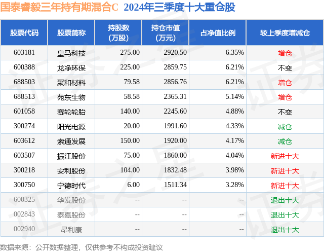 从基金规模来看,国泰睿毅三年持有期混合C基金2024年三季度公布的基金规模为0.4亿元,较上一期规模3427.91万元变化了613.45万元,环比变化了17.9%。该基金最新一期资产配置为:股票占净值比91.06%,无债券类资产,现金占净值比9.07%。从基金持仓来看,该基金当季前十大股票仓位达48.59%,第一大重仓股为皇马科技(603181),持仓占比为6.35%。