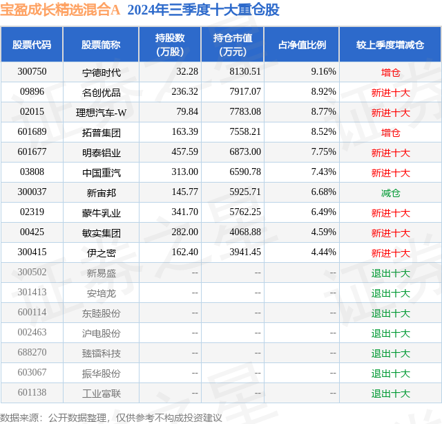 从基金规模来看,宝盈成长精选混合A基金2024年三季度公布的基金规模为6.69亿元,较上一期规模5.9亿元变化了7925.49万元,环比变化了13.43%。该基金最新一期资产配置为:股票占净值比89.37%,无债券类资产,现金占净值比7.08%。从基金持仓来看,该基金当季前十大股票仓位达72.75%,第一大重仓股为宁德时代(300750),持仓占比为9.16%。
