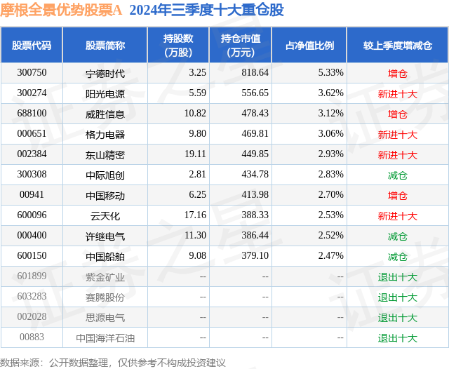 从基金规模来看,摩根全景优势股票A基金2024年三季度公布的基金规模为1.46亿元,较上一期规模1.47亿元变化了-177.29万元,环比变化了-1.2%。该基金最新一期资产配置为:股票占净值比86.59%,无债券类资产,现金占净值比14.64%。从基金持仓来看,该基金当季前十大股票仓位达31.11%,第一大重仓股为宁德时代(300750),持仓占比为5.33%。