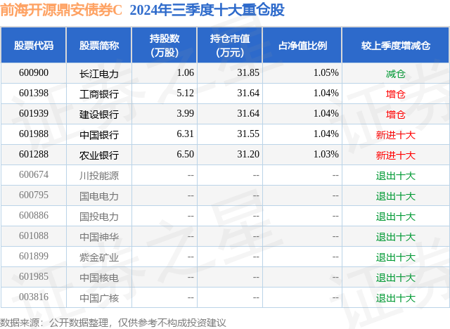 从基金规模来看,前海开源鼎安债券C基金2024年三季度公布的基金规模为0.2亿元,较上一期规模1857.47万元变化了180.82万元,环比变化了9.73%。该基金最新一期资产配置为:股票占净值比5.19%,债券占净值比82.14%,现金占净值比1.76%。从基金持仓来看,该基金当季前十大股票仓位达5.2%,第一大重仓股为长江电力(600900),持仓占比为1.05%。