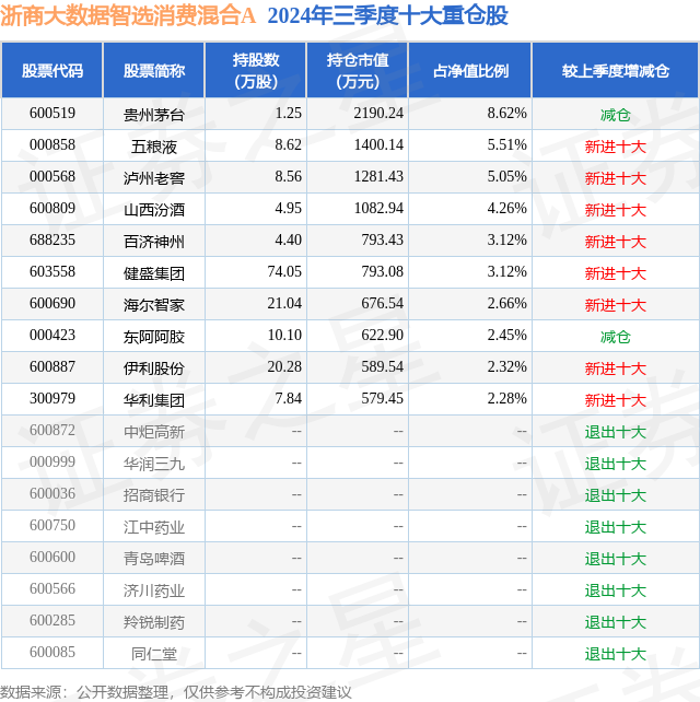 从基金规模来看,浙商大数据智选消费混合A基金2024年三季度公布的基金规模为2.54亿元,较上一期规模2.43亿元变化了1029.91万元,环比变化了4.23%。该基金最新一期资产配置为:股票占净值比93.39%,无债券类资产,现金占净值比12.44%。从基金持仓来看,该基金当季前十大股票仓位达39.39%,第一大重仓股为贵州茅台(600519),持仓占比为8.62%。