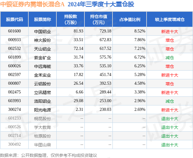 从基金规模来看,中银证券内需增长混合A基金2024年三季度公布的基金规模为0.7亿元,较上一期规模6803.24万元变化了238.4万元,环比变化了3.5%。该基金最新一期资产配置为:股票占净值比93.72%,债券占净值比4.62%,现金占净值比1.39%。从基金持仓来看,该基金当季前十大股票仓位达55.45%,第一大重仓股为中国铝业(601600),持仓占比为8.52%。