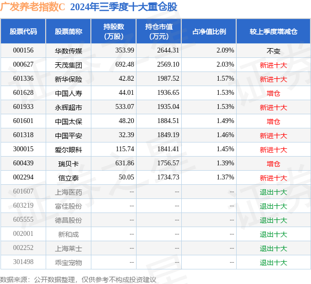 从基金规模来看,广发养老指数C基金2024年三季度公布的基金规模为0.82亿元,较上一期规模6713.16万元变化了1512.42万元,环比变化了22.53%。该基金最新一期资产配置为:股票占净值比94.3%,债券占净值比0.3%,现金占净值比5.35%。从基金持仓来看,该基金当季前十大股票仓位达15.91%,第一大重仓股为华数传媒(000156),持仓占比为2.09%。
