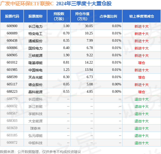从基金规模来看,广发中证环保ETF联接C基金2024年三季度公布的基金规模为3.05亿元,较上一期规模2.72亿元变化了3282.85万元,环比变化了12.08%。该基金最新一期资产配置为:股票占净值比0.14%,债券占净值比0.72%,现金占净值比4.58%。从基金持仓来看,该基金当季前十大股票仓位达0.1%,第一大重仓股为长江电力(600900),持仓占比为0.03%。