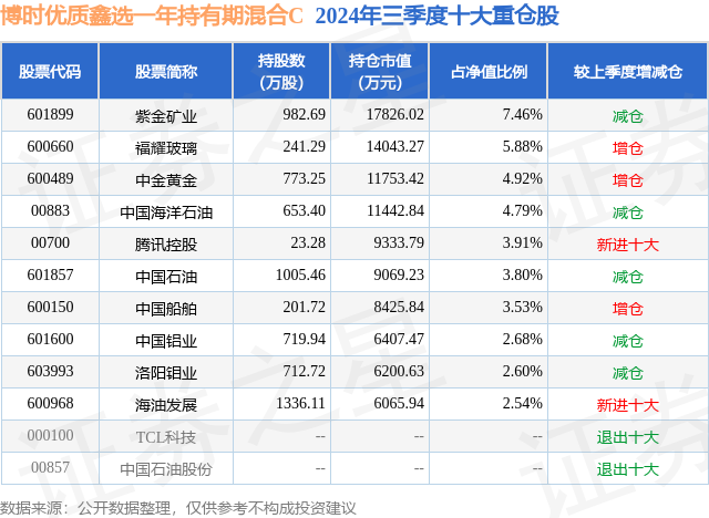 从基金规模来看,博时优质鑫选一年持有期混合C基金2024年三季度公布的基金规模为0.21亿元,较上一期规模2264.84万元变化了-127.38万元,环比变化了-5.62%。该基金最新一期资产配置为:股票占净值比74.43%,无债券类资产,现金占净值比27.93%。从基金持仓来看,该基金当季前十大股票仓位达42.11%,第一大重仓股为紫金矿业(601899),持仓占比为7.46%。
