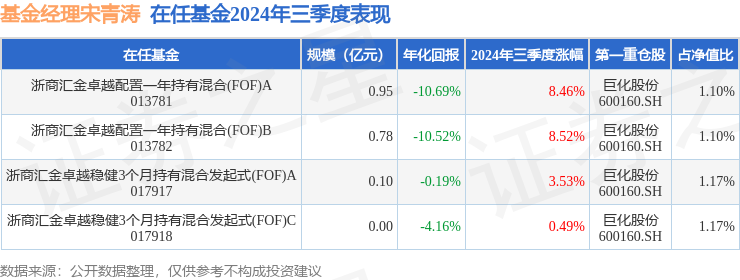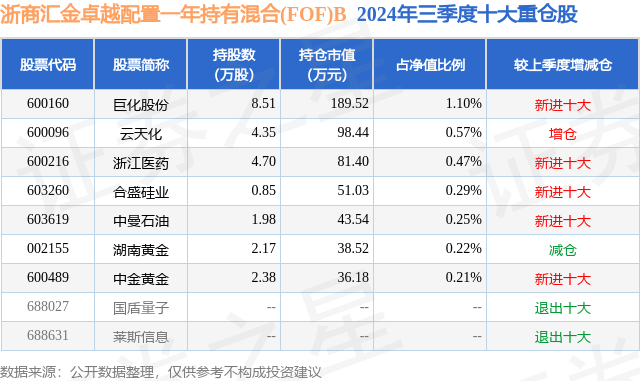 从基金规模来看,浙商汇金卓越配置一年持有混合(FOF)B基金2024年三季度公布的基金规模为0.78亿元,较上一期规模7496.11万元变化了262.8万元,环比变化了3.51%。该基金最新一期资产配置为:股票占净值比3.11%,债券占净值比2.95%,现金占净值比4.61%。从基金持仓来看,该基金当季前十大股票仓位达3.11%,第一大重仓股为巨化股份(600160),持仓占比为1.1%。
