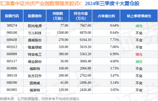 从基金规模来看,汇添富中证光伏产业指数增强发起式C基金2024年三季度公布的基金规模为5.13亿元,较上一期规模4.65亿元变化了4797.52万元,环比变化了10.33%。该基金最新一期资产配置为:股票占净值比92.18%,债券占净值比0.63%,现金占净值比5.48%。从基金持仓来看,该基金当季前十大股票仓位达58.07%,第一大重仓股为阳光电源(300274),持仓占比为9.64%。