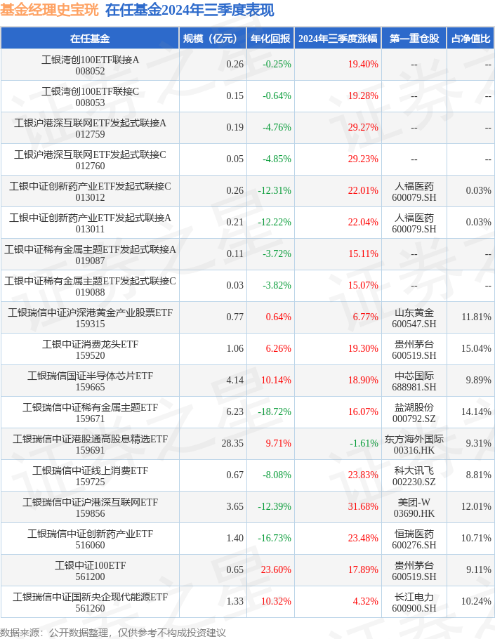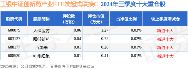 从基金规模来看,工银中证创新药产业ETF发起式联接C基金2024年三季度公布的基金规模为0.26亿元,较上一期规模2477.65万元变化了166.19万元,环比变化了6.71%。该基金最新一期资产配置为:股票占净值比0.06%,无债券类资产,现金占净值比6.22%。从基金持仓来看,该基金当季前十大股票仓位达0.07%,第一大重仓股为人福医药(600079),持仓占比为0.03%。