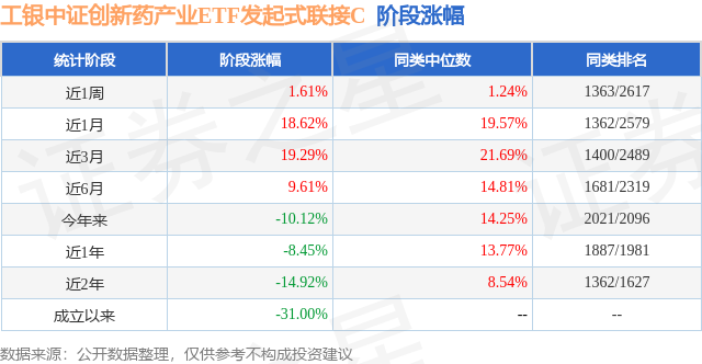 从业绩表现来看,工银中证创新药产业ETF发起式联接C基金过去一年净值涨幅为-8.45%,在同类基金中排名1887/1981,同类基金过去一年净值涨幅中位数为13.77%。而基金过去一年的最大回撤为-32.71%,成立以来的最大回撤为-45.16%。