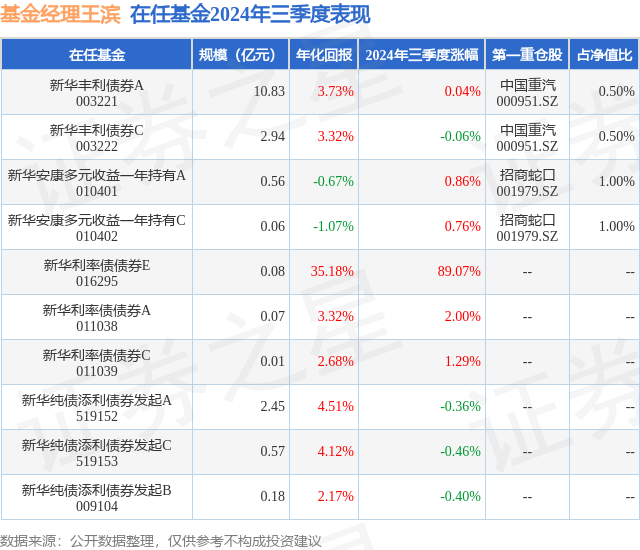 新华丰利债券C现任基金经理为王滨,本季度增聘基金经理王滨,近期离任的基金经理为郑毅、于航。其中在任基金经理王滨已从业6年又284天,2024年7月3日正式接手管理新华丰利债券C,任职期间累计回报为-0.73%。目前还管理着10只基金产品(包括A类和C类),其中本季度表现最佳的基金为新华利率债债券E(016295),季度净值涨幅为89.07%。