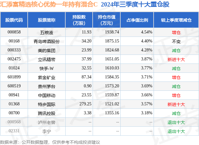 从基金规模来看,汇添富精选核心优势一年持有混合C基金2024年三季度公布的基金规模为0.18亿元,较上一期规模1672.02万元变化了138.18万元,环比变化了8.26%。该基金最新一期资产配置为:股票占净值比83.66%,无债券类资产,现金占净值比18.12%。从基金持仓来看,该基金当季前十大股票仓位达38.67%,第一大重仓股为五粮液(000858),持仓占比为4.54%。