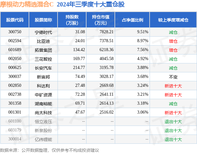 从基金规模来看,摩根动力精选混合C基金2024年三季度公布的基金规模为1.52亿元,较上一期规模1.3亿元变化了2138.22万元,环比变化了16.41%。该基金最新一期资产配置为:股票占净值比94.38%,无债券类资产,现金占净值比6.1%。从基金持仓来看,该基金当季前十大股票仓位达51.21%,第一大重仓股为宁德时代(300750),持仓占比为9.51%。