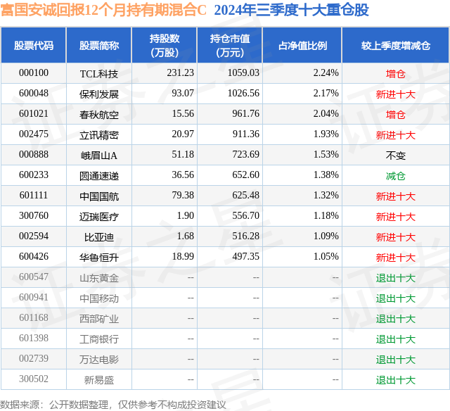 从基金规模来看,富国安诚回报12个月持有期混合C基金2024年三季度公布的基金规模为2.63亿元,较上一期规模2.81亿元变化了-1762.84万元,环比变化了-6.28%。该基金最新一期资产配置为:股票占净值比30.45%,债券占净值比64.02%,现金占净值比9.59%。从基金持仓来看,该基金当季前十大股票仓位达15.93%,第一大重仓股为TCL科技(000100),持仓占比为2.24%。