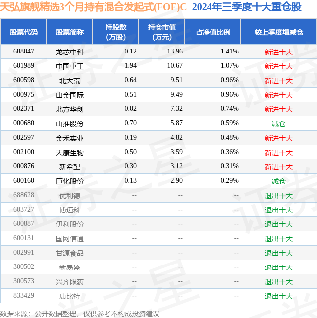 从基金规模来看,天弘旗舰精选3个月持有混合发起式(FOF)C基金2024年三季度公布的基金规模为0.04亿元,较上一期规模409.03万元变化了29.99万元,环比变化了7.33%。该基金最新一期资产配置为:股票占净值比7.73%,债券占净值比4.11%,现金占净值比3.48%。从基金持仓来看,该基金当季前十大股票仓位达7.17%,第一大重仓股为龙芯中科(688047),持仓占比为1.41%。