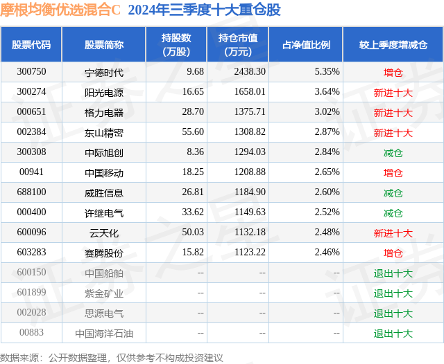从基金规模来看,摩根均衡优选混合C基金2024年三季度公布的基金规模为0.36亿元,较上一期规模3588.18万元变化了-3.03万元,环比变化了-0.08%。该基金最新一期资产配置为:股票占净值比86.2%,无债券类资产,现金占净值比14.28%。从基金持仓来看,该基金当季前十大股票仓位达30.43%,第一大重仓股为宁德时代(300750),持仓占比为5.35%。