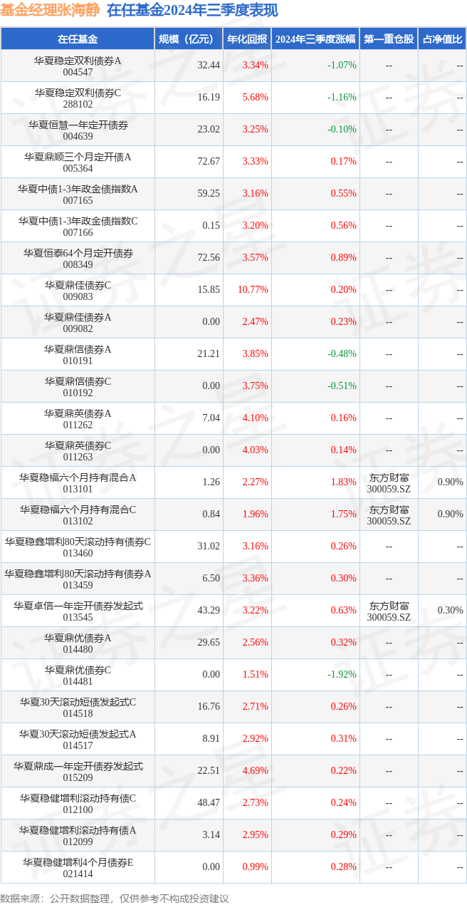 从基金规模来看,华夏稳福六个月持有混合A基金2024年三季度公布的基金规模为1.26亿元,较上一期规模1.35亿元变化了-868.12万元,环比变化了-6.44%。该基金最新一期资产配置为:股票占净值比13.8%,债券占净值比108.28%,现金占净值比3.99%。从基金持仓来看,该基金当季前十大股票仓位达5.66%,第一大重仓股为东方财富(300059),持仓占比为0.9%。