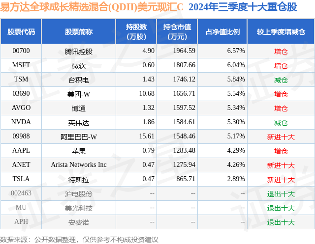 从基金规模来看,易方达全球成长精选混合(QDII)美元现汇C基金2024年三季度公布的基金规模为1.14亿元,较上一期规模8569.89万元变化了2840.63万元,环比变化了33.15%。该基金最新一期资产配置为:股票占净值比86.17%,无债券类资产,现金占净值比9.52%。从基金持仓来看,该基金当季前十大股票仓位达51.24%,第一大重仓股为腾讯控股(00700),持仓占比为6.57%。