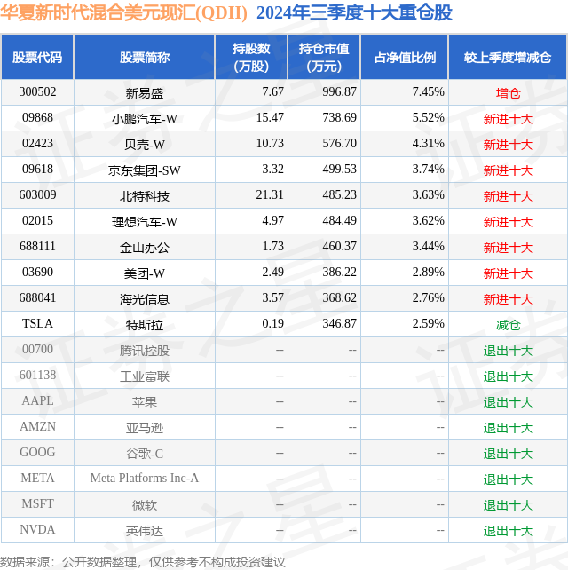 从基金规模来看,华夏新时代混合美元现汇(QDII)基金2024年三季度公布的基金规模为1.34亿元,较上一期规模1.28亿元变化了575.29万元,环比变化了4.5%。该基金最新一期资产配置为:股票占净值比68.52%,债券占净值比0.19%,现金占净值比20.93%。从基金持仓来看,该基金当季前十大股票仓位达39.95%,第一大重仓股为新易盛(300502),持仓占比为7.45%。