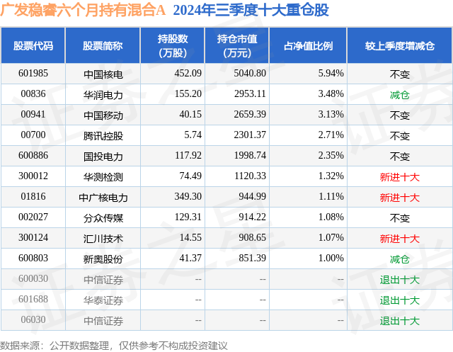 从基金规模来看,广发稳睿六个月持有混合A基金2024年三季度公布的基金规模为4.42亿元,较上一期规模4.63亿元变化了-2086.71万元,环比变化了-4.51%。该基金最新一期资产配置为:股票占净值比25.24%,债券占净值比97.8%,现金占净值比2.35%。从基金持仓来看,该基金当季前十大股票仓位达23.19%,第一大重仓股为中国核电(601985),持仓占比为5.94%。