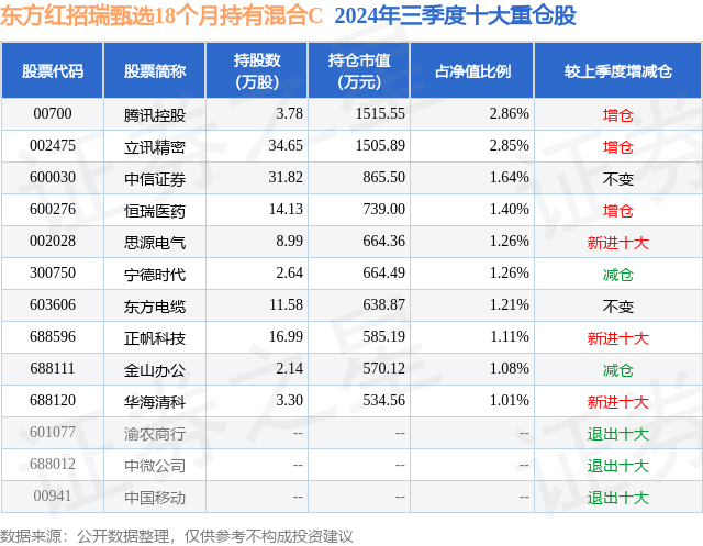 从基金规模来看,东方红招瑞甄选18个月持有混合C基金2024年三季度公布的基金规模为0.49亿元,较上一期规模5235.18万元变化了-347.73万元,环比变化了-6.64%。该基金最新一期资产配置为:股票占净值比28.43%,债券占净值比97.9%,现金占净值比3.41%。从基金持仓来看,该基金当季前十大股票仓位达15.68%,第一大重仓股为腾讯控股(00700),持仓占比为2.86%。