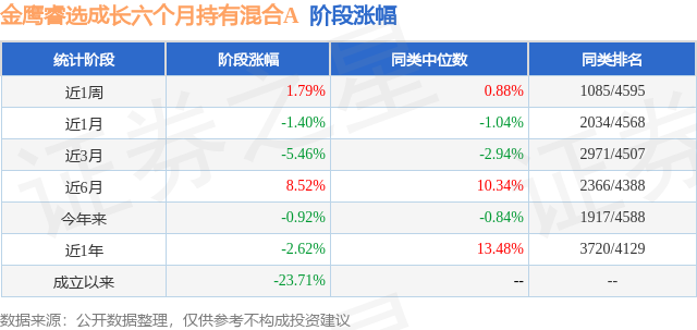 从业绩表现来看,金鹰睿选成长六个月持有混合A基金过去一年净值涨幅为-19.17%,在同类基金中排名3941/3979,同类基金过去一年净值涨幅中位数为5.4%。而基金过去一年的最大回撤为-37.71%,成立以来的最大回撤为-37.71%。