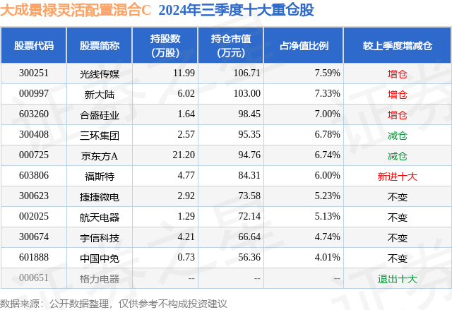 从基金规模来看,大成景禄灵活配置混合C基金2024年三季度公布的基金规模为0.03亿元,较上一期规模270.57万元变化了61.92万元,环比变化了22.88%。该基金最新一期资产配置为:股票占净值比93.03%,无债券类资产,现金占净值比6.2%。从基金持仓来看,该基金当季前十大股票仓位达60.55%,第一大重仓股为光线传媒(300251),持仓占比为7.59%。