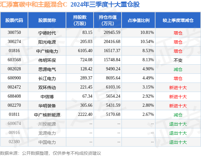 证券之星消息,日前汇添富碳中和主题混合C基金公布三季报,2024年三季度最新规模4.02亿元,季度净值涨幅为9.26%。