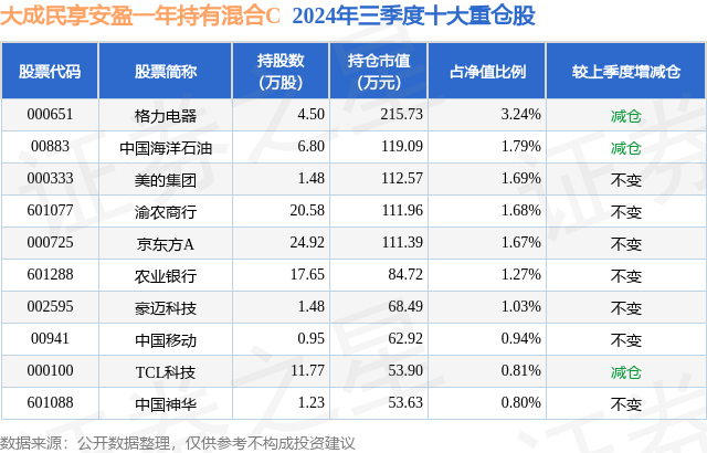 从基金规模来看,大成民享安盈一年持有混合C基金2024年三季度公布的基金规模为0.01亿元,较上一期规模224.66万元变化了-104.29万元,环比变化了-46.42%。该基金最新一期资产配置为:股票占净值比17.9%,债券占净值比85.08%,现金占净值比2.84%。从基金持仓来看,该基金当季前十大股票仓位达14.92%,第一大重仓股为格力电器(000651),持仓占比为3.24%。