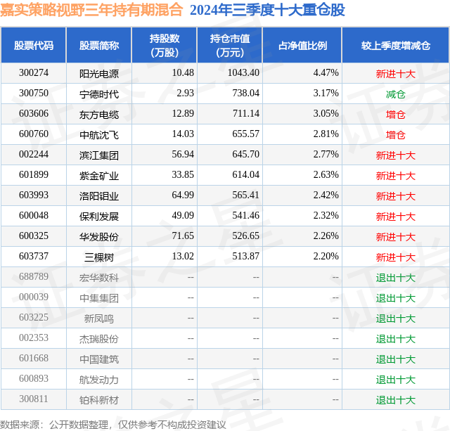 从基金规模来看,嘉实策略视野三年持有期混合基金2024年三季度公布的基金规模为2.33亿元,较上一期规模2.09亿元变化了2447.45万元,环比变化了11.73%。该基金最新一期资产配置为:股票占净值比88.23%,无债券类资产,现金占净值比9.31%。从基金持仓来看,该基金当季前十大股票仓位达28.1%,第一大重仓股为阳光电源(300274),持仓占比为4.47%。