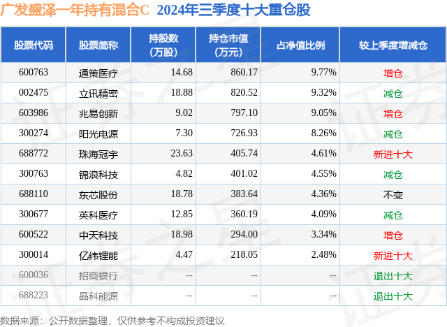 从基金规模来看,广发盛泽一年持有混合C基金2024年三季度公布的基金规模为0.11亿元,较上一期规模975.41万元变化了120.72万元,环比变化了12.38%。该基金最新一期资产配置为:股票占净值比93.56%,无债券类资产,现金占净值比6.76%。从基金持仓来看,该基金当季前十大股票仓位达59.83%,第一大重仓股为通策医疗(600763),持仓占比为9.77%。