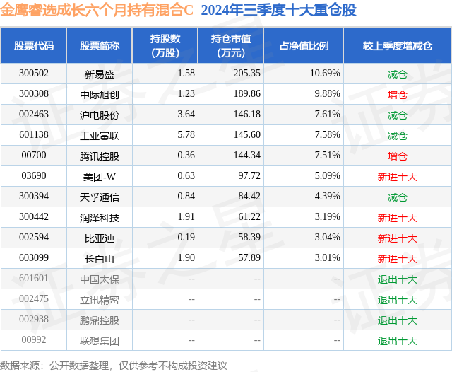 从基金规模来看,金鹰睿选成长六个月持有混合C基金2024年三季度公布的基金规模为0.07亿元,较上一期规模723.14万元变化了8.91万元,环比变化了1.23%。该基金最新一期资产配置为:股票占净值比90.87%,无债券类资产,现金占净值比0.19%。从基金持仓来看,该基金当季前十大股票仓位达61.99%,第一大重仓股为新易盛(300502),持仓占比为10.69%。