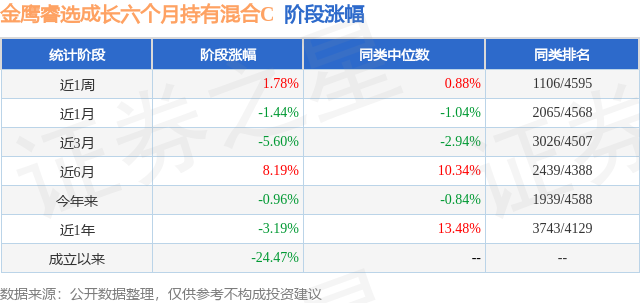 从业绩表现来看,金鹰睿选成长六个月持有混合C基金过去一年净值涨幅为-19.67%,在同类基金中排名3943/3979,同类基金过去一年净值涨幅中位数为5.4%。而基金过去一年的最大回撤为-38.0%,成立以来的最大回撤为-38.2%。