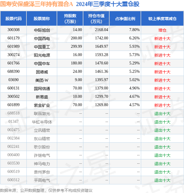 从基金规模来看,国寿安保盛泽三年持有混合A基金2024年三季度公布的基金规模为2.66亿元,较上一期规模2.47亿元变化了1926.2万元,环比变化了7.81%。该基金最新一期资产配置为:股票占净值比91.23%,债券占净值比6.61%,现金占净值比7.29%。从基金持仓来看,该基金当季前十大股票仓位达55.48%,第一大重仓股为中际旭创(300308),持仓占比为7.8%。