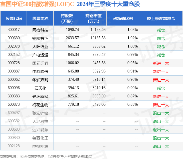 从基金规模来看,富国中证500指数增强(LOF)C基金2024年三季度公布的基金规模为16.37亿元,较上一期规模11.65亿元变化了4.72亿元,环比变化了40.5%。该基金最新一期资产配置为:股票占净值比90.6%,无债券类资产,现金占净值比5.55%。从基金持仓来看,该基金当季前十大股票仓位达9.42%,第一大重仓股为网宿科技(300017),持仓占比为1.03%。