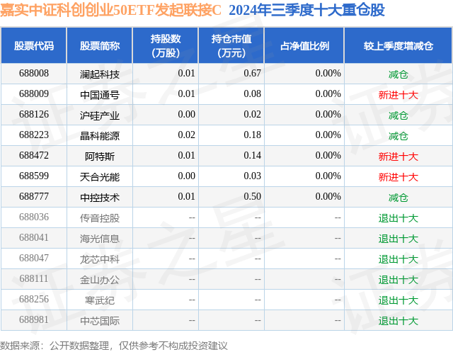 从基金规模来看,嘉实中证科创创业50ETF发起联接C基金2024年三季度公布的基金规模为2.12亿元,较上一期规模1.43亿元变化了6879.63万元,环比变化了47.98%。该基金最新一期资产配置为:股票占净值比0.01%,债券占净值比0.17%,现金占净值比4.99%。从基金持仓来看,该基金当季前十大股票仓位达0.0%,第一大重仓股为澜起科技(688008),持仓占比为0.0%。