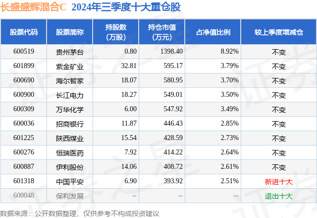 从基金规模来看,长盛盛辉混合C基金2024年三季度公布的基金规模为0.11亿元,较上一期规模995.25万元变化了76.17万元,环比变化了7.65%。该基金最新一期资产配置为:股票占净值比50.27%,债券占净值比84.5%,现金占净值比1.44%。从基金持仓来看,该基金当季前十大股票仓位达36.74%,第一大重仓股为贵州茅台(600519),持仓占比为8.92%。