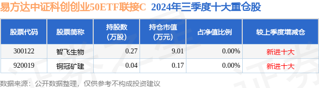 从基金规模来看,易方达中证科创创业50ETF联接C基金2024年三季度公布的基金规模为4.8亿元,较上一期规模3.66亿元变化了1.14亿元,环比变化了31.07%。该基金最新一期资产配置为:无股票类资产,债券占净值比1.65%,现金占净值比2.8%。从基金持仓来看,该基金当季前十大股票仓位达0.0%,第一大重仓股为智飞生物(300122),持仓占比为0.0%。