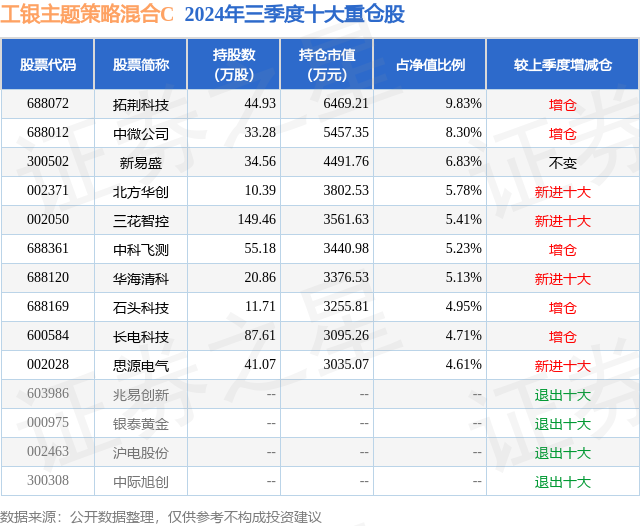 从基金规模来看,工银主题策略混合C基金2024年三季度公布的基金规模为0.11亿元,较上一期规模967.48万元变化了109.76万元,环比变化了11.34%。该基金最新一期资产配置为:股票占净值比94.49%,无债券类资产,现金占净值比5.2%。从基金持仓来看,该基金当季前十大股票仓位达60.78%,第一大重仓股为拓荆科技(688072),持仓占比为9.83%。
